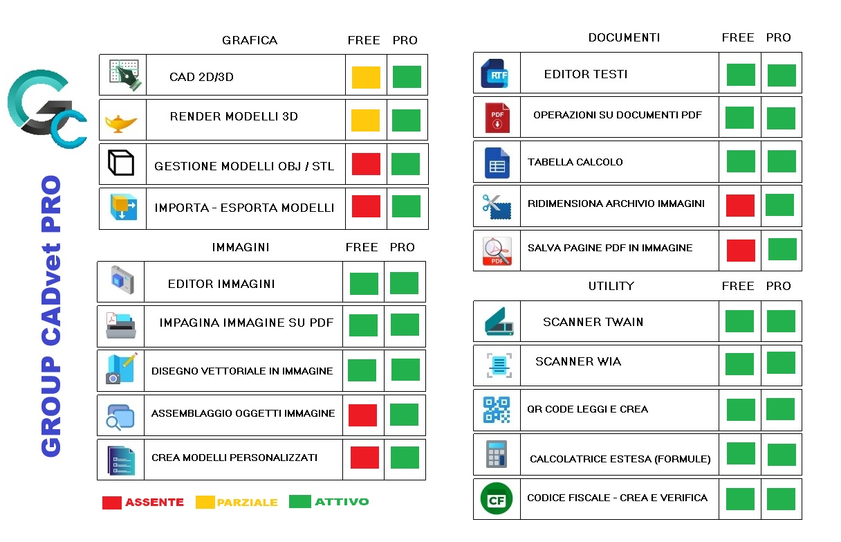 Il CAD CADvet ha tutti gli strumenti attivi ad eccezione della gestione / creazione di elementi tridimensionali, importare / esportare formati vettoriali (DWF, DWT, PLT, STL, OBJ, DWG).